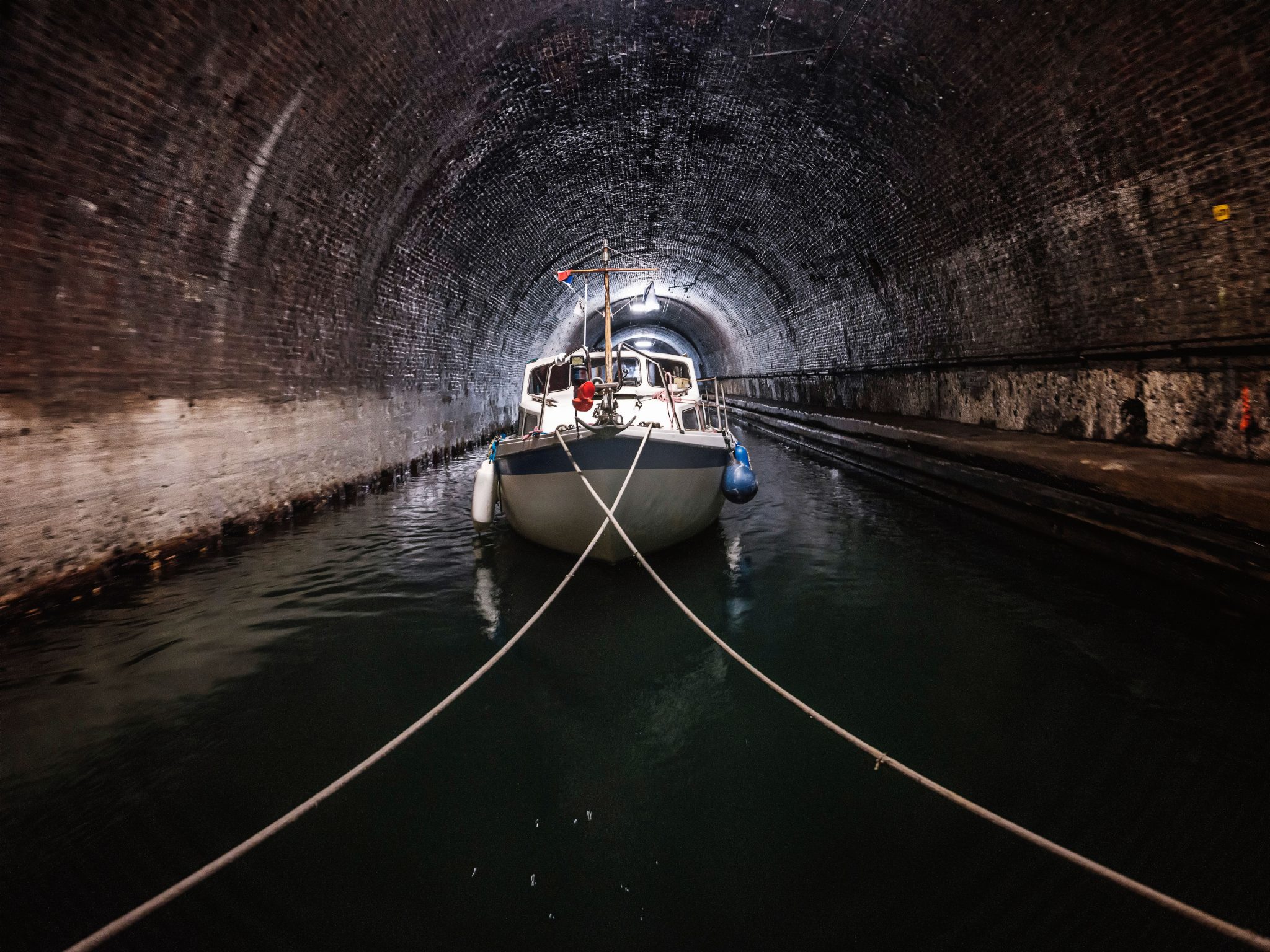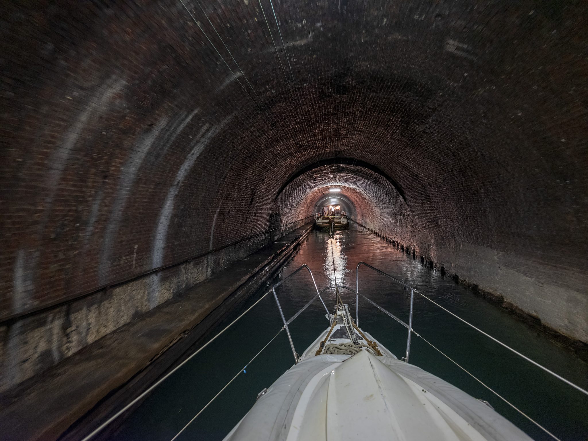 Aufbruch in der Dämmerung nach St. Quentin mit vierzehn Schleusen und dem Tunnel von Riqueval, vor dem uns Seppo eindringlich gewarnt hatte. Sein Schiff lief hieraus sehr verschrammt und mit verbogenen Relingstützen im Hafen ein. Er wurde auf Grund seiner Länge direkt hinter dem Kettenschlepper gezogen. An seinem Heck hing noch ein Tross von kleineren Schiffen, jedoch nicht mit überkreuzten Leinen. Dadurch schrammte sein Boot in der leichten Biegung der fast 6 km langen Tunnels am Trottoir oder der Tunnelwölbung entlang. Zu allem Unglück konnte er im Anschluß wegen eines Schraubendefekts nicht mehr aus eigener Kraft weiter fahren.