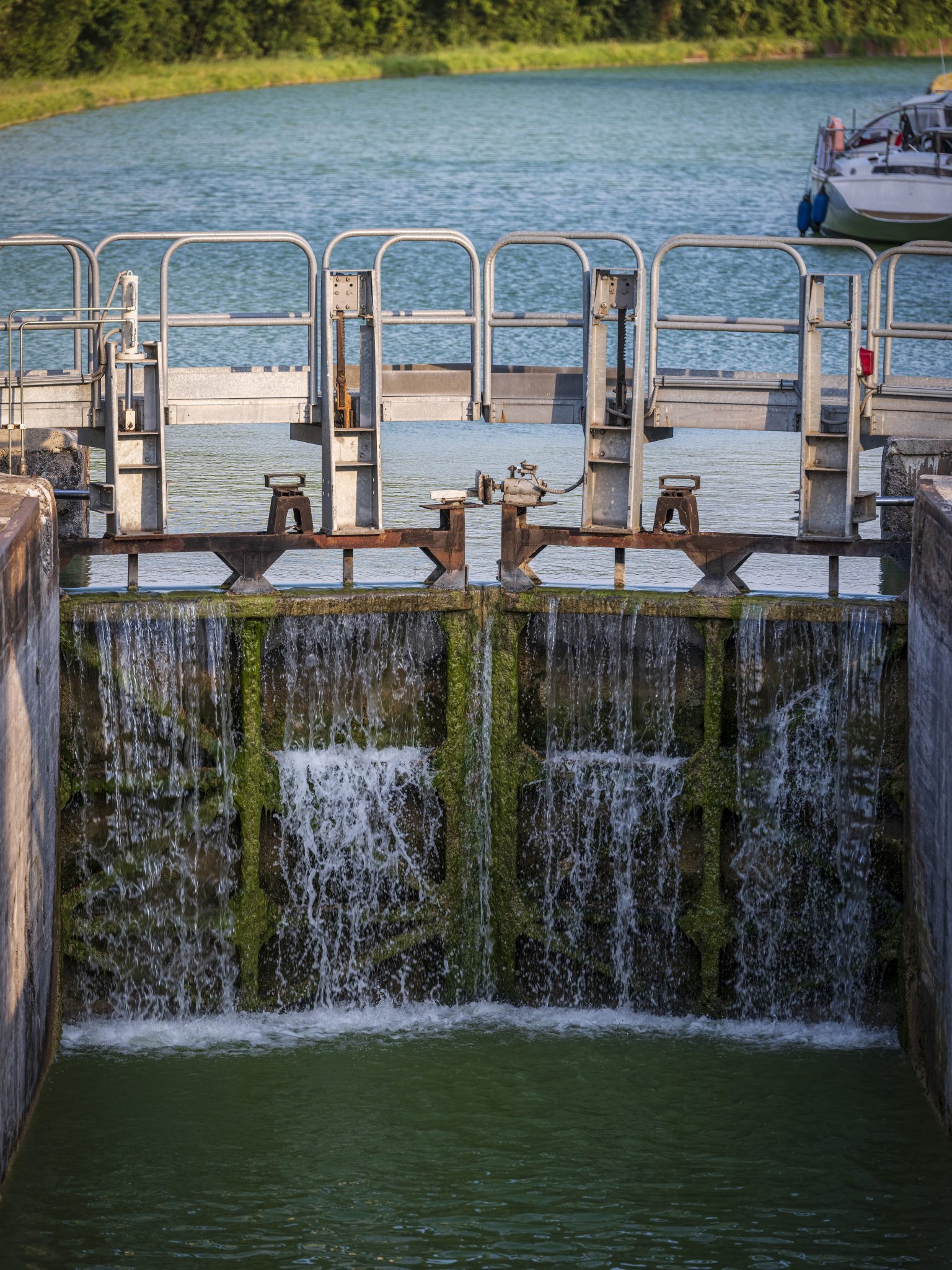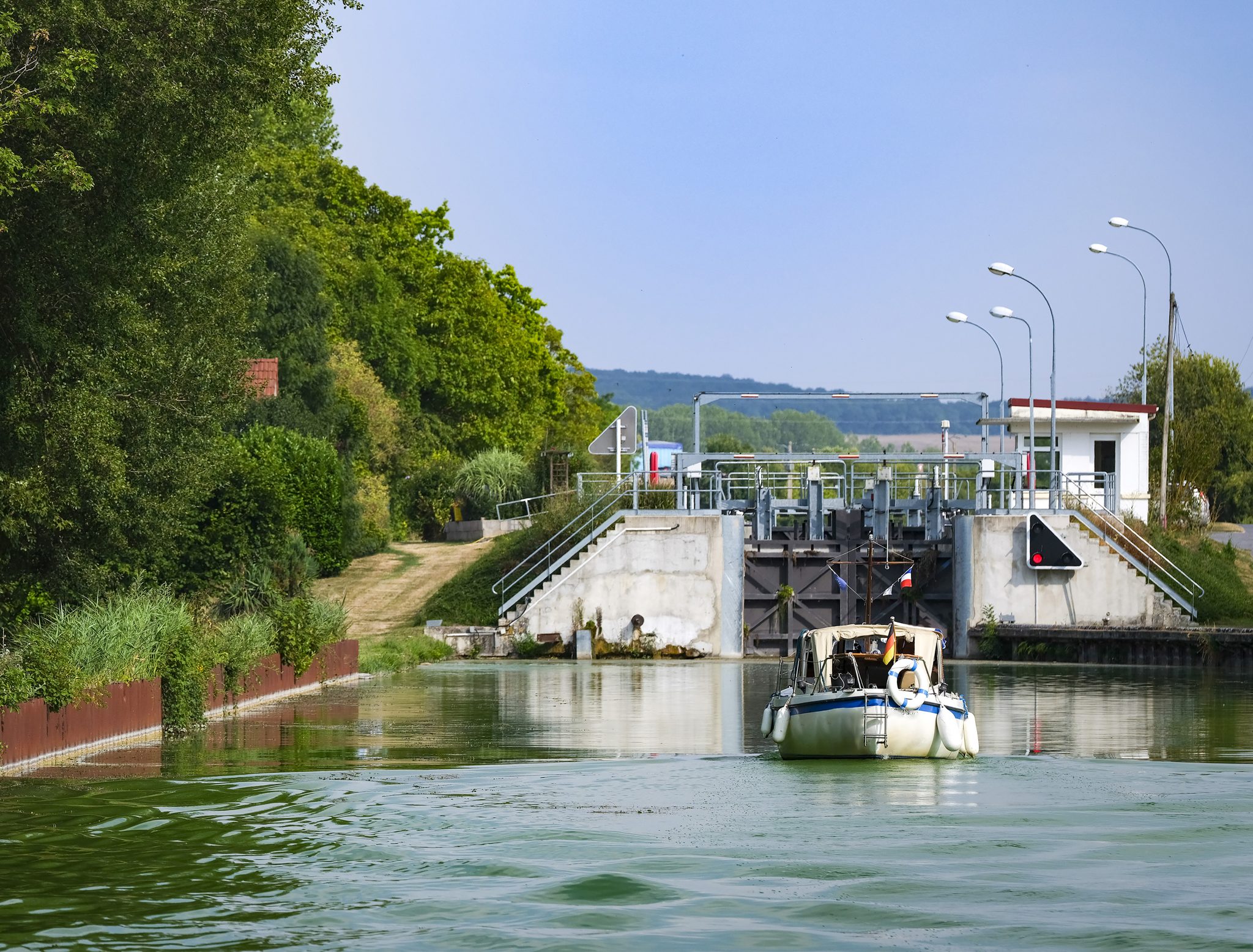 Hundstage mit über 40 Grad im Schatten, aber am Steuer war nur „plain soleil“. An manchen Abschnitten konnte ich mich kurz unter Fahrt durchs Wasser ziehen lassen, keine wirkliche Abkühlung. Am Steuer standen wir mit in Wasser getauchten dicken Frotteetüchern und die nach 20 Minuten wieder getrocknet waren.